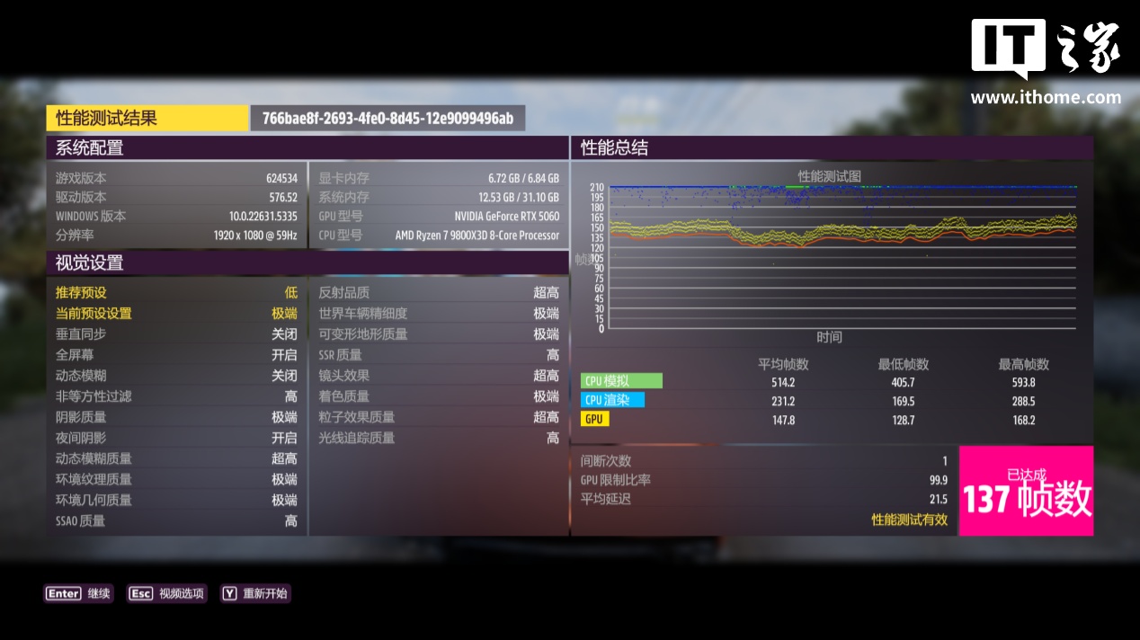 RTX 5060 在 1080P 分辨率 + 极端画质下,游戏平均帧数 137 帧,1% Low 帧 108 帧;
