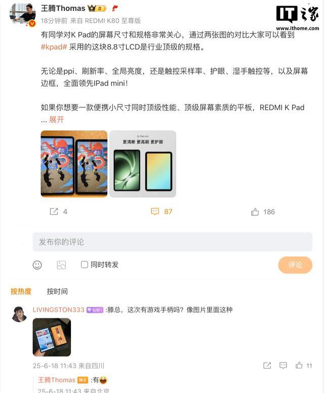 IT之家 6 月 18 日消息,小米中国区市场部总经理、REDMI 品牌总经理 @王腾Thomas 今日预热 REDMI K Pad 平板的屏幕有关信息。他表示,该平板采用的 8.8 英寸 LCD 是行业顶级规格,无论是 ppi、刷新率、全局亮度,还是触控采样率、护眼、湿手触控等,以及屏幕边框,全面领先 iPad mini。