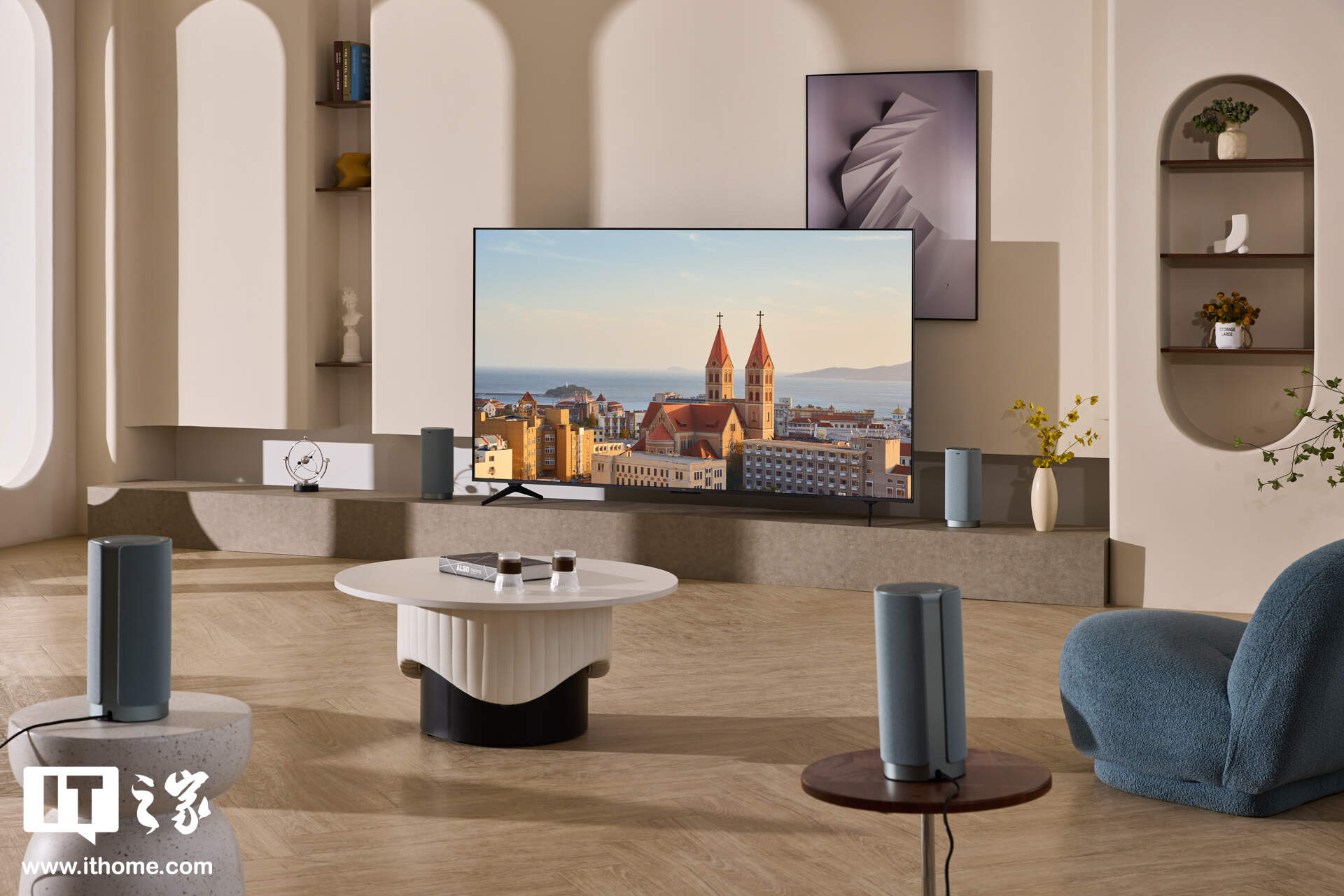 每个 Z100 音箱实际上包含四个声音单元,组成 1.1.1 的声道,且单个 Z100 的峰值功率高达 170W,高频扬声器频率达 20KHz,还配备铷铁硼磁铁扬声器。四个 Z100 组合起来,整套系统将拥有 16 个物理单元,再加上电视本身的协同发声,形成多声道全景声系统,可以说是降维打击了。