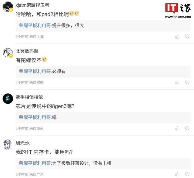 荣耀终端股份有限公司平板与 IOT 产品领域总经理 @荣耀平板利用哥 还在评论区回复了部分网友的问题:针对新机是否有陀螺仪,他表示“必须有”;针对处理器是否为骁龙 8 Gen3 ,他回复“嗯”。