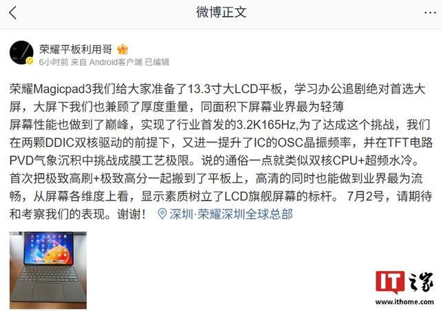 荣耀终端股份有限公司平板与 IOT 产品领域总经理 @荣耀平板利用哥 今日发文透露,MagicPad 3 平板配备 13.3 寸大 LCD 屏幕,行业首发 3.2K 165Hz 画面(两颗 DDIC 双核驱动、提升 IC 的 OSC 晶振频率、在 TFT 电路 PVD 气象沉积中挑战成膜工艺极限),首次把极致高刷 + 极致高分一起带到平板。