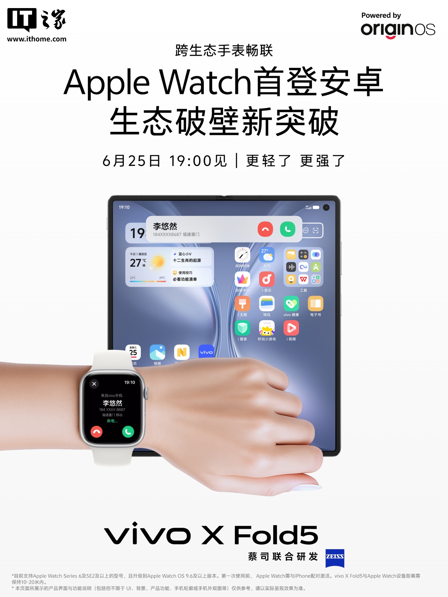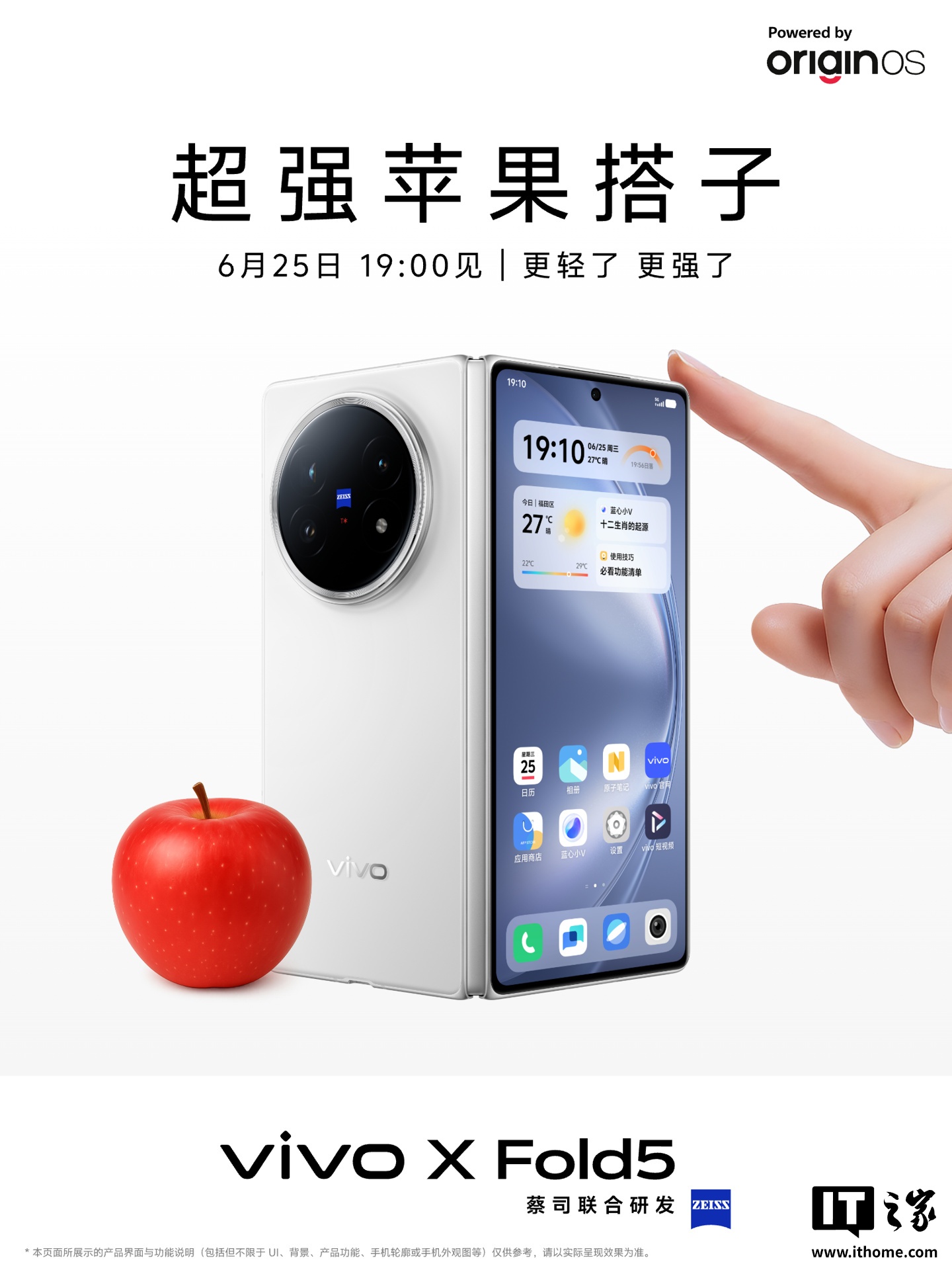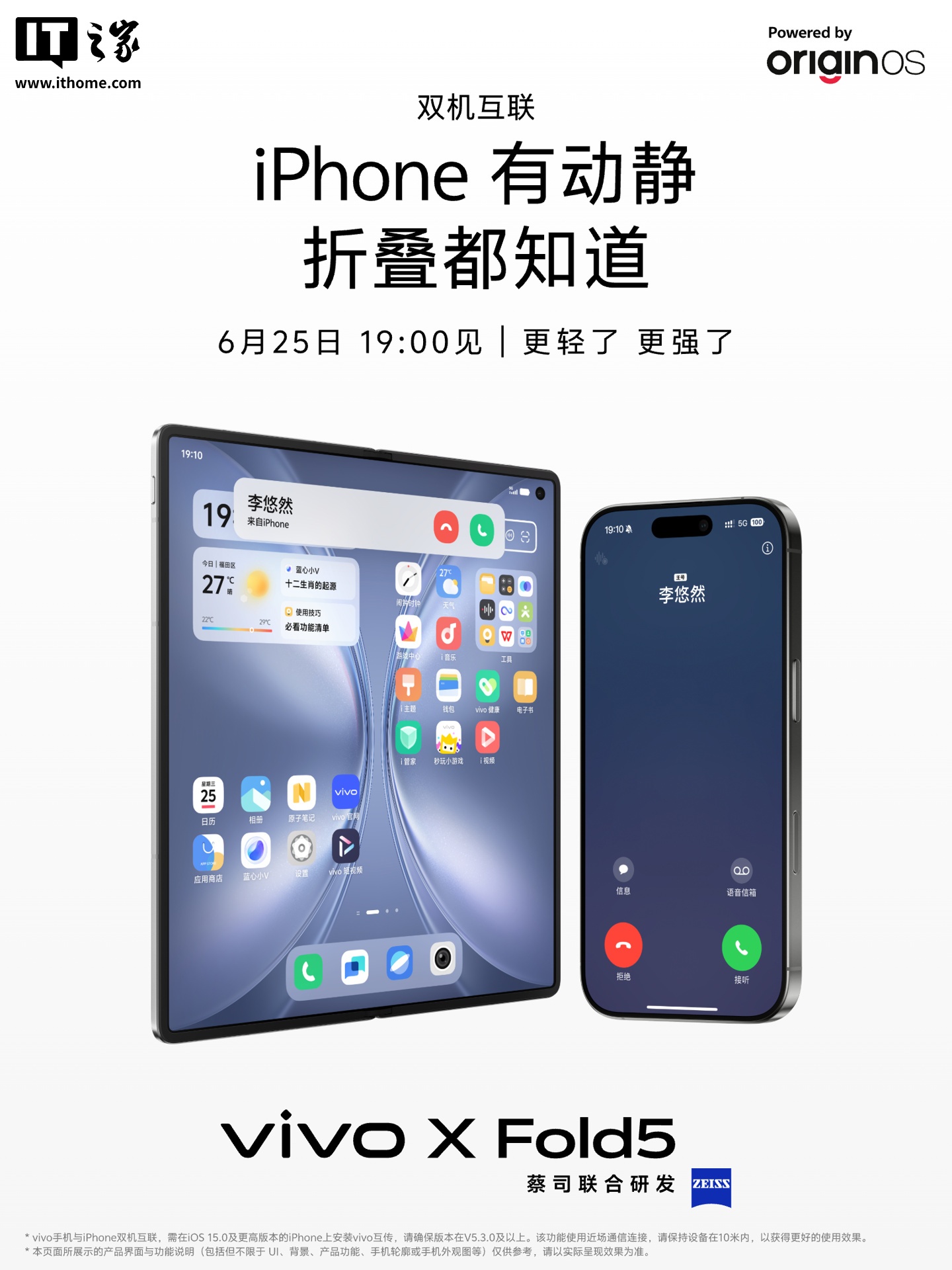 IT之家 6 月 19 日消息,vivo 将于 6 月 25 日 19:00 发布其新款折叠屏手机 vivo X Fold5,vivo 手机操作系统官方微博 @OriginOS原系统 今日公布了新机与苹果设备互联的亮点信息,号称“超强苹果搭子”。