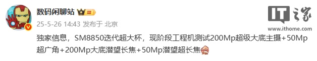 值得一提的是,上个月,该博主还曝光某厂 SM8850 迭代超大杯工程机测试 200Mp 超级大底主摄 + 50Mp 超广角 + 200Mp 大底潜望长焦 + 50Mp 潜望超长焦。预计正是这款新机的 AB 两种测试方案。