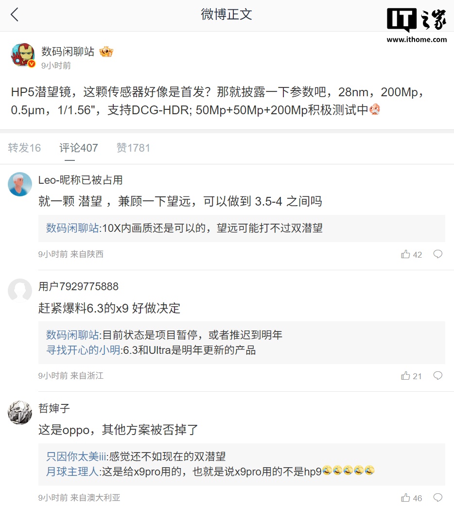 该博主还称,50Mp+50Mp+200Mp 积极测试中。下方评论区多个网友猜测,该传感器将由 OPPO 首发,还有人具体猜测为 OPPO Find X9 Pro。