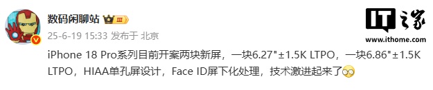 IT之家 6 月 19 日消息,博主 @数码闲聊站 今日爆料称,苹果 iPhone 18 Pro 系列目前开案两块新屏,一块 6.27 英寸 ±1.5K LTPO,一块 6.86 英寸 ±1.5K LTPO,HIAA 单孔屏设计,Face ID 屏下化处理。