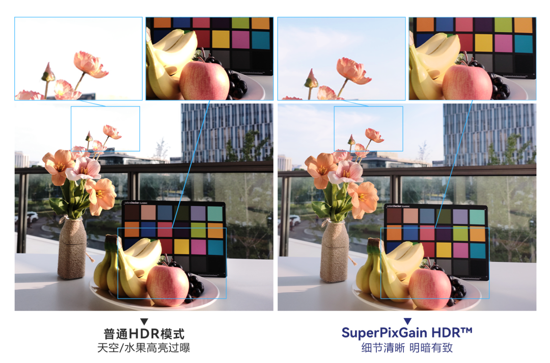 基于思特威 SuperPixGain HDR 技术,SC595XS 实现了最高可达 110dB 高动态范围,较同平台前代产品大幅提升约 22dB。因此,SC595XS 能够在明暗对比强烈、光线条件复杂的环境中,帮助手机摄像头捕捉到更多的亮部与暗部细节,减少照片与视频高亮过曝、暗处细节丢失等情况的出现。