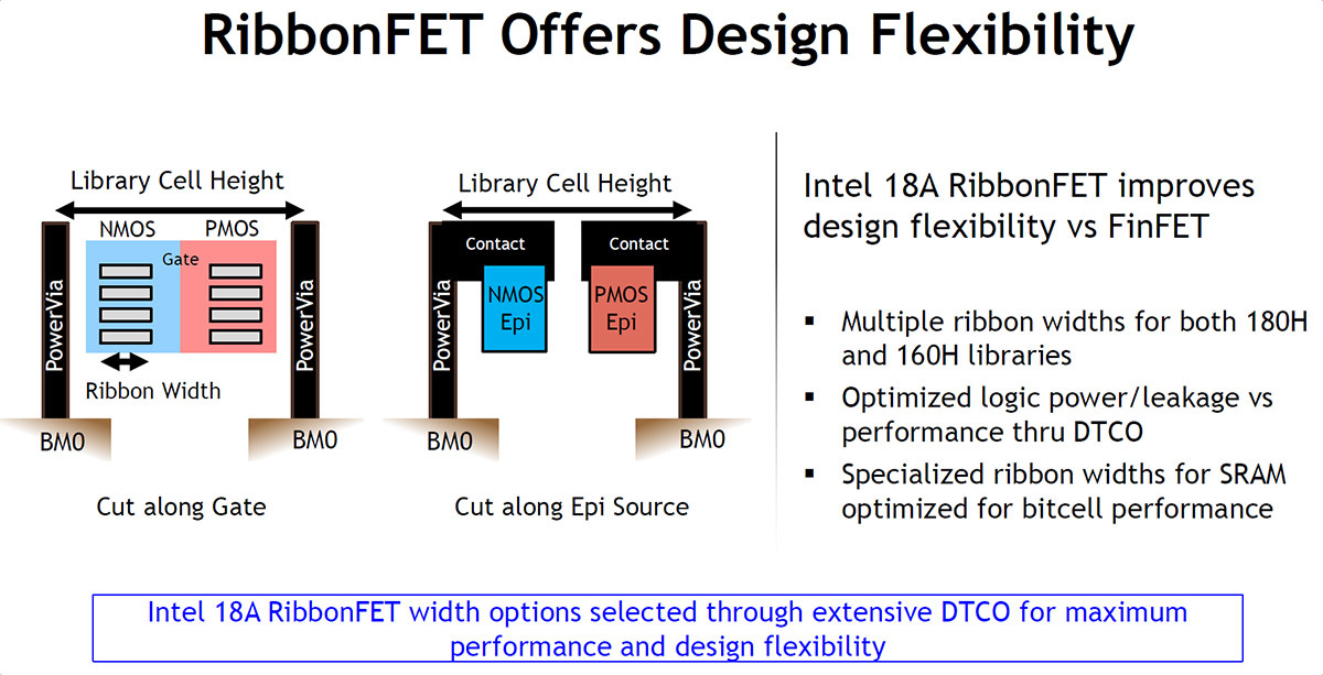 Intel还在RibbonFET上改进了灵活性设计,较原本的FinFET更优秀,为180H和160H库引入了多种带状宽度,透过DTCO优化逻辑功耗、漏电与性能,并为SRAM设计了专门优化的带状宽度以优化位单元性能,所有这些都增强了Intel 18A制程上制造的下一代芯片的性能和设计能力。