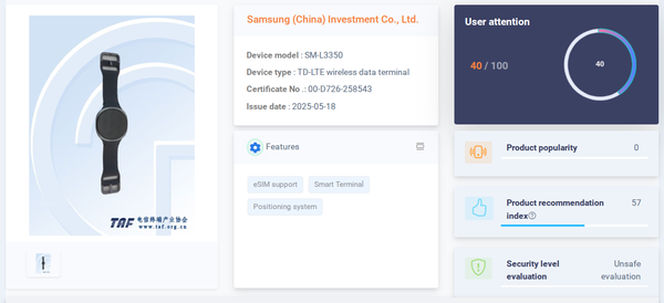 三星Watch 8 LTE版本的型号为SM-L3350,认证编号为00-D726-258543。这款智能手表的功能特点包括:支持eSIM、4G连接、支持中国联通和中国电信运营商、Android操作系统以及426mAh电池。连接规格包括AGPS、GPS、GLONASS、NFC、WLAN和蓝牙。
