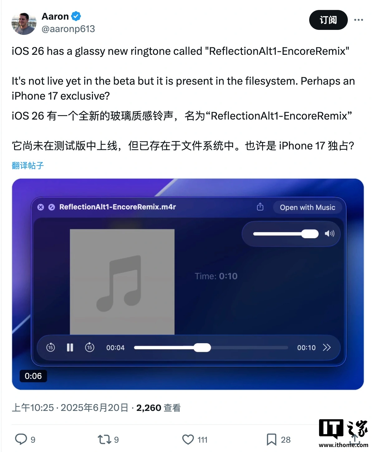 Aaron 也表示,iOS 26 新增了一个名为“ReflectionAlt1-EncoreRemix”的玻璃质感铃声,虽然目前尚未在测试版中启用,但已出现在系统文件中,他猜测这或许由 iPhone 17 独占。