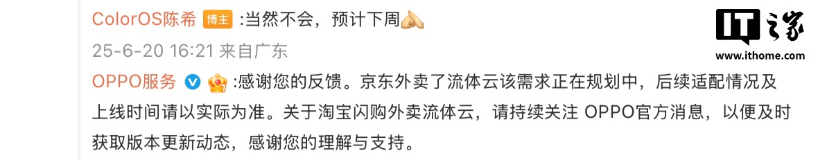 IT之家 6 月 22 日消息,OPPO ColorOS 设计总监陈希在微博上透露百度地图 App 驾车导航已接入 ColorOS 流体云,评论区有用户询问“京东外卖和淘宝闪购何时适配”,对此陈希回应称“预计下周(即 6 月 23 日至 6 月 29 日)适配(京东外卖)”。另综合“OPPO 服务”微博回应内容,预计淘宝闪购适配流体云还要等待一段时间。