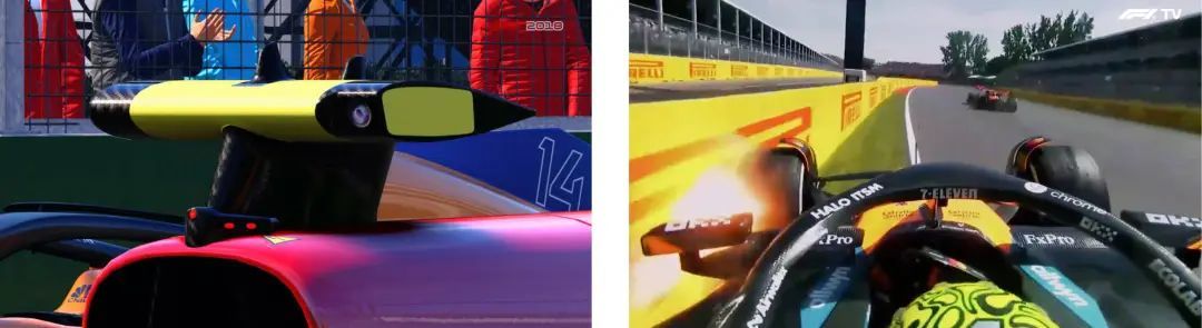 左图为 T-cam,右图为 F1 赛车直转播画面中 T-cam 拍摄的画面。 图片来自:reddit、F1