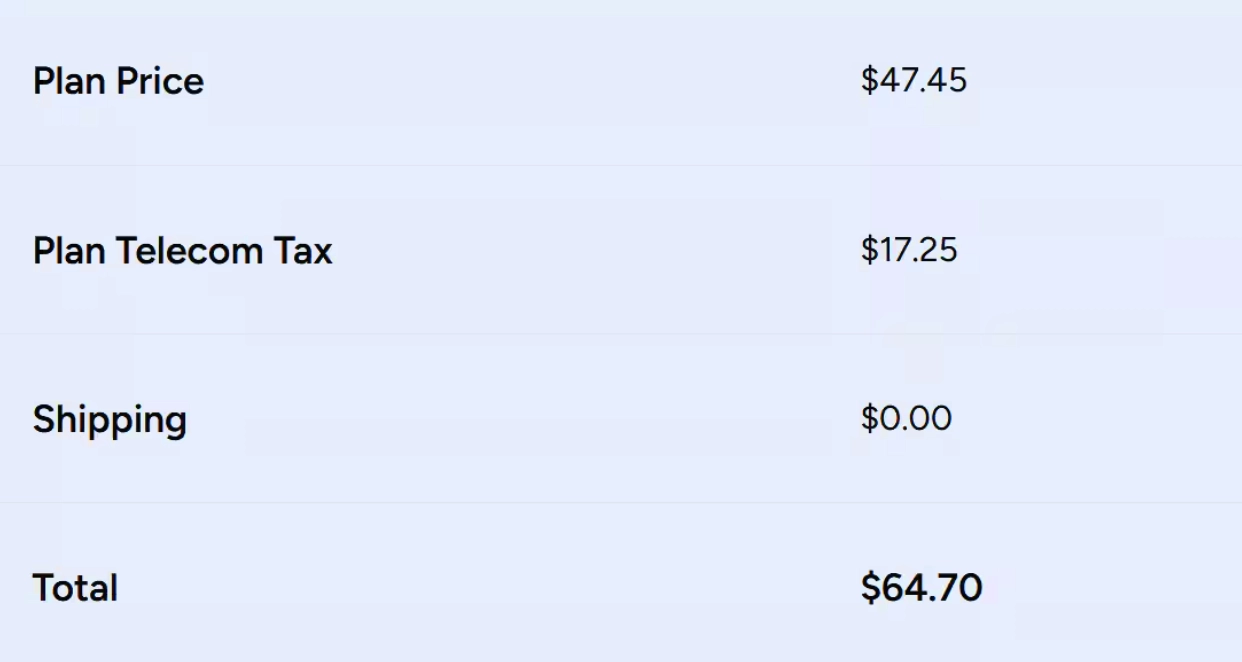 第一个让她吃惊的是价格。Trump Mobile 宣传的月套餐价格为 47.45 美元,但是当她输入个人信息和信用卡信息后,又出现了一个“套餐电信税”(plan telecom tax),金额是每月 17.25 美元。这样算下来,总的套餐费为 64.70 美元。