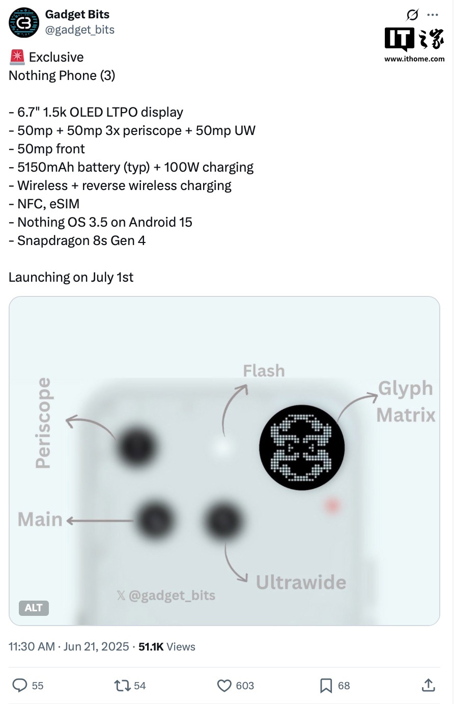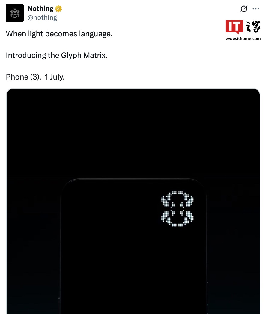 IT之家 6 月 23 日消息,消息源 Gadget_bit 公布了 Nothing 公司即将在 7 月 1 日公布的 Nothing Phone(3)手机的模糊谍照,展示了该机后置摄像头布局及 Glyph Matrix 数显矩阵屏。