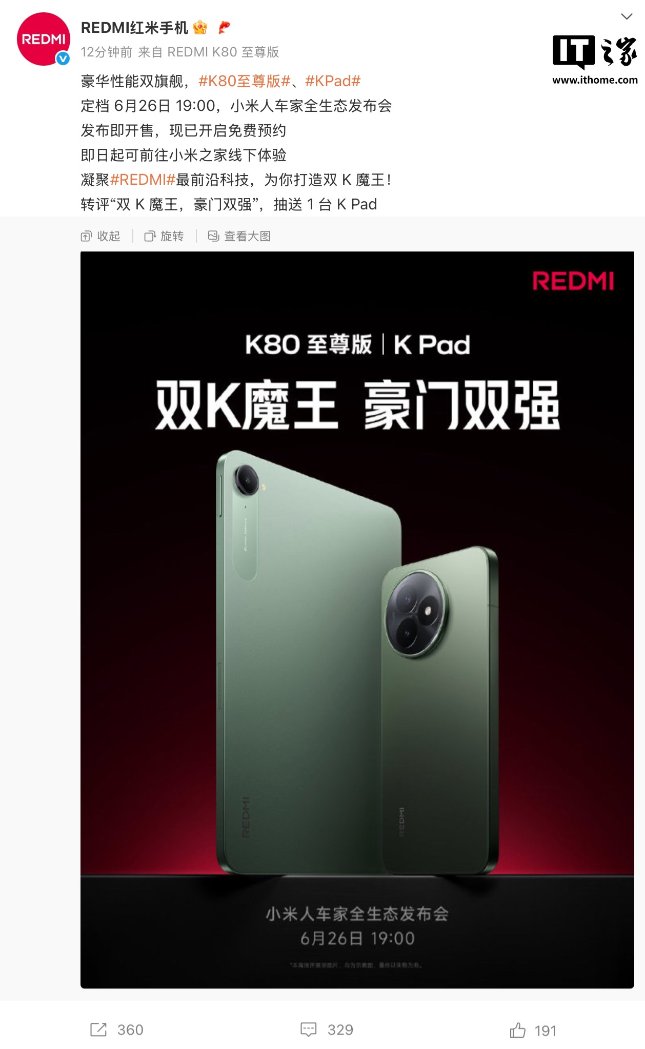 IT之家 6 月 23 日消息,REDMI 红米手机官方微博官宣旗下小米 REDMI K80 至尊版手机及 REDMI K Pad 游戏平板将于 6 月 26 日 19:00 的发布会中登场,发布即开售,相应产品现已开启免费预约。