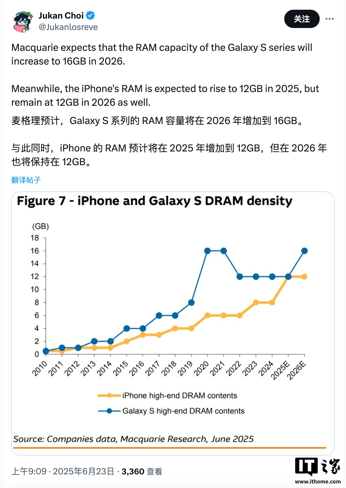 爆料人 @Jukanlosreve 援引麦格理研究提供的数据称,三星计划在 2026 年初为 Galaxy S26 系列全面提升内存容量至 16GB,即使是基础款也能运行更多 AI 功能、后台保留更多应用,提高多任务处理能力。相比之下,该研究机构认为苹果短期内不会提升 iPhone 的内存,仍会维持在 12GB。