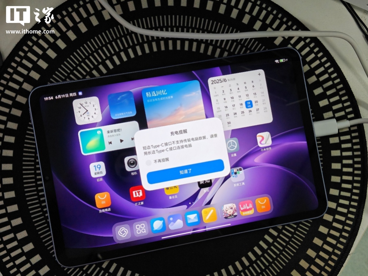 另外,在外观部分提到的双 USB-C 接口也是目前小尺寸安卓游戏平板的标配了,但对 REDMI K Pad 来说有个需要注意的地方,机身右侧的 USB-C 接口只支持充电,而不支持数据传输,用数据线连接其它设备后会弹窗提醒。如果你有连接安卓拉伸式手柄打游戏的需求,只能等官方手柄配件上市了。