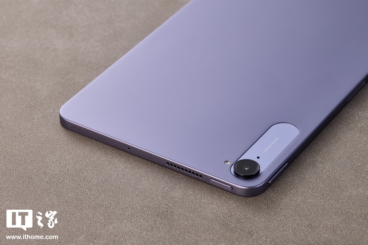 前置 800W 像素摄像头挖孔很小,被放置在平板左侧内边框中间位置(横向握持时),平板物理按键集中在中框左上角(横向握持时)的两侧。