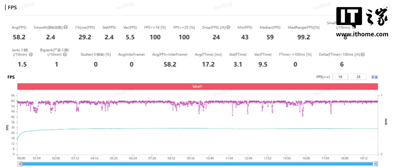 按照惯例还是在最高画质 + Vulkan(普通模式),25℃室温环境下,以 75% 亮度和 50% 外放音量在‘匹诺康尼-黄金的时刻’地图进行跑图测试,15 分钟后通过性能狗的测试结果来看,游戏平均帧数为 59.7 帧,40% Low 帧也达到了 40.1 帧,帧率曲线非常平稳。实际游戏中的体感温度比手机凉快不少,机身最高温度 41.5℃,而手持区域温度均在 36℃以下。