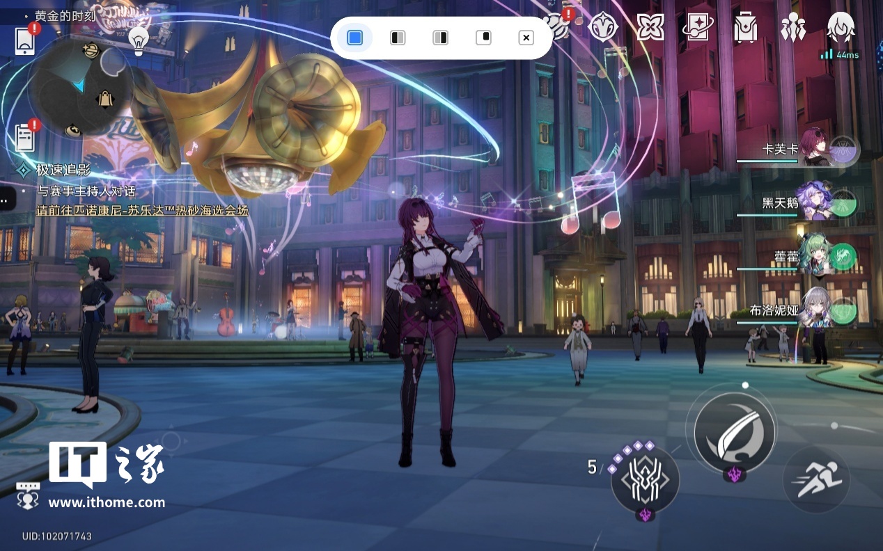 第二是游戏分屏功能,进入游戏后画面顶部居中位置会常驻一个半透明的三小点按钮,点击它即可呼出分屏模式选择浮窗,选中的模式会变成蓝色,从左到右依次是全屏、左半屏显示、右半屏显示、独立浮窗显示以及回到桌面。