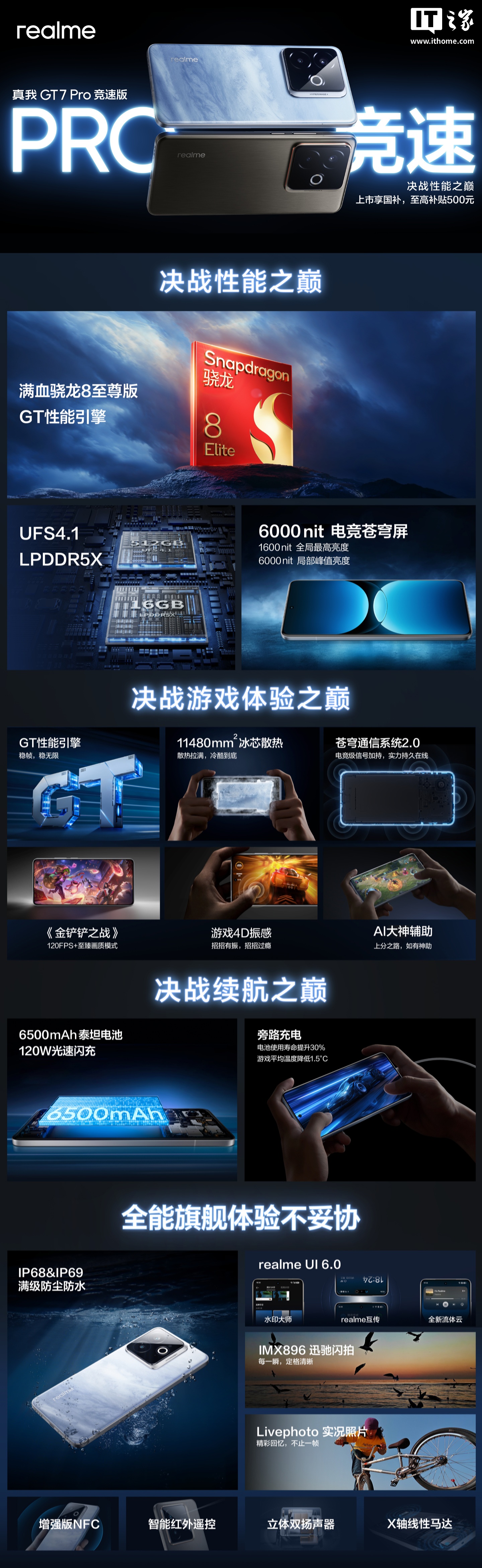 该机还内置 6500mAh 泰坦电池,支持 120W 快充。同时新机还搭载「旁路充电」技术,宣称电源绕过电池直接向游戏供电,降低设备发热,帧率更稳。真我 GT7 Pro 竞速版支持 IP68&IP69 满级防水,预装 realmeUI 6.0 系统,提供水印大师、realme 互传、全新流体云、LivePhoto 实况照片等功能。
