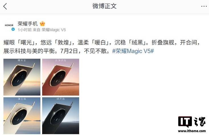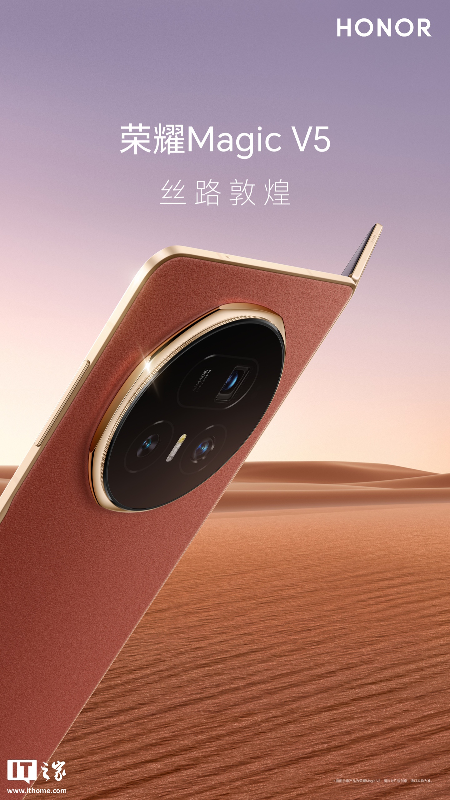 文章来源于互联网:IT之家-荣耀 Magic V5 折叠屏手机四配色外观公布,含「曙光」「敦煌」「暖白」「绒黑」