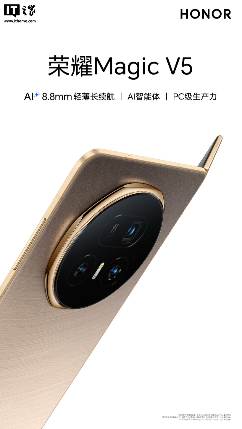 据IT之家昨日报道,有爆料称,荣耀 Magic V5 折叠屏手机的机身最薄 8.8mm、最轻 217g,搭载骁龙 8 Elite 处理器(骁龙 8 至尊版)、6100mAh 电池、侧边指纹解锁。影像方面,该机搭载 AiMAGE 影像系统,光圈 F1.6-F2.5,焦段 13mm-70mm,有一颗 3X 光变潜望镜。