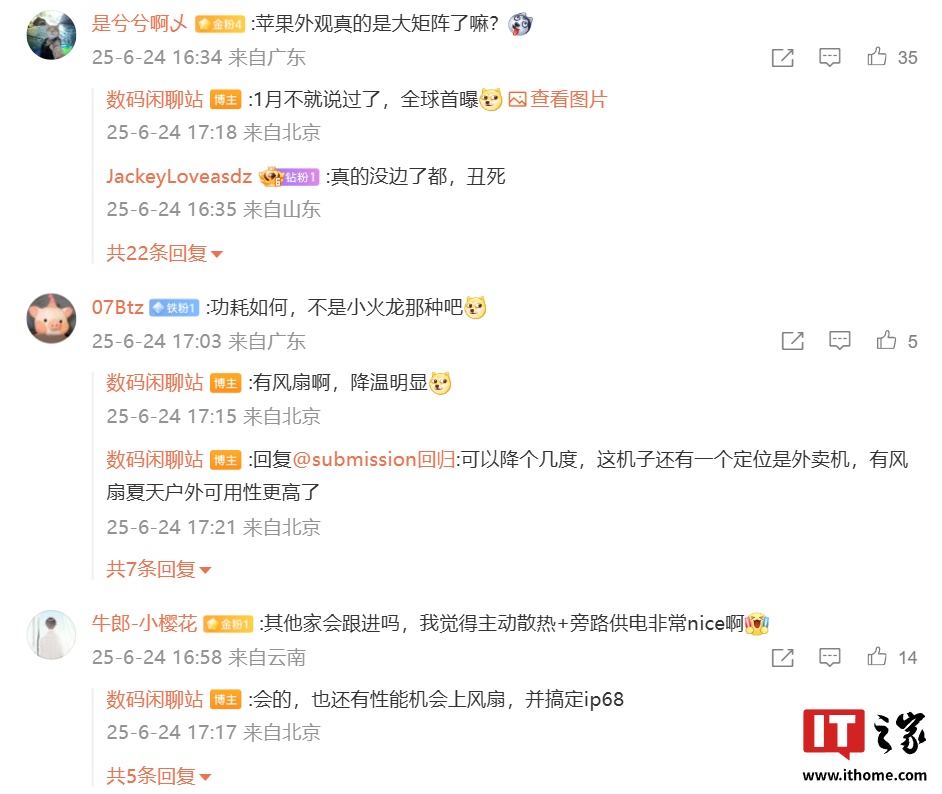 该博主还在评论区回复了部分网友的问题:针对新机功耗、温控如何,他回复“有风扇啊,降温明显”“可以降个几度,这机子还有一个定位是外卖机,有风扇夏天户外可用性更高了”;针对其他厂商是否会跟进,他表示“会的,也还有性能机会上风扇,并搞定 ip68”。