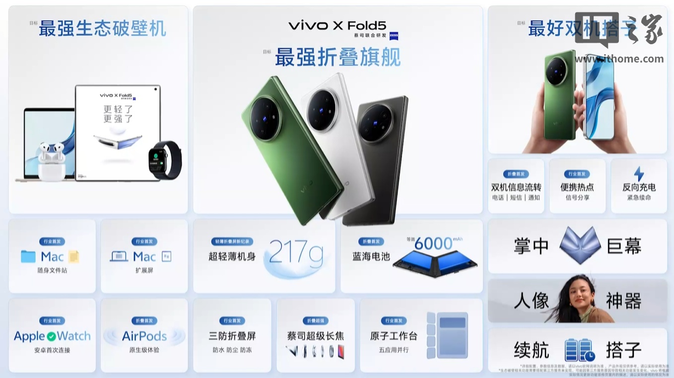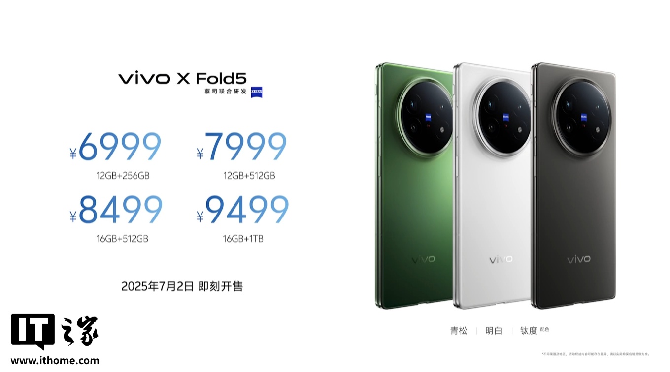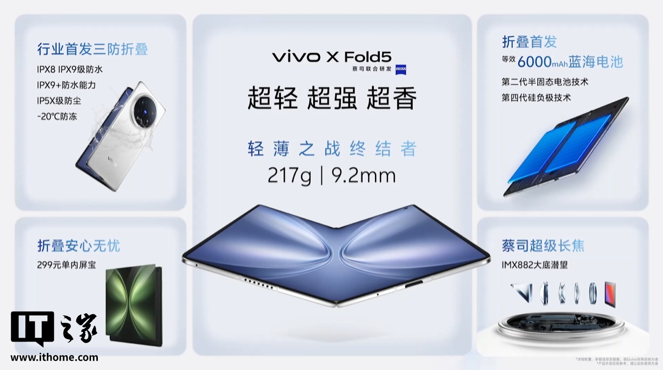 IT之家 6 月 25 日消息,全球最轻大折叠手机 vivo X Fold5 今日晚正式发布,新机搭载骁龙 8 Gen3 处理器、采用 217g 轻薄机身设计、首发等效 6000mAh 蓝海电池,售价 6999 元起。