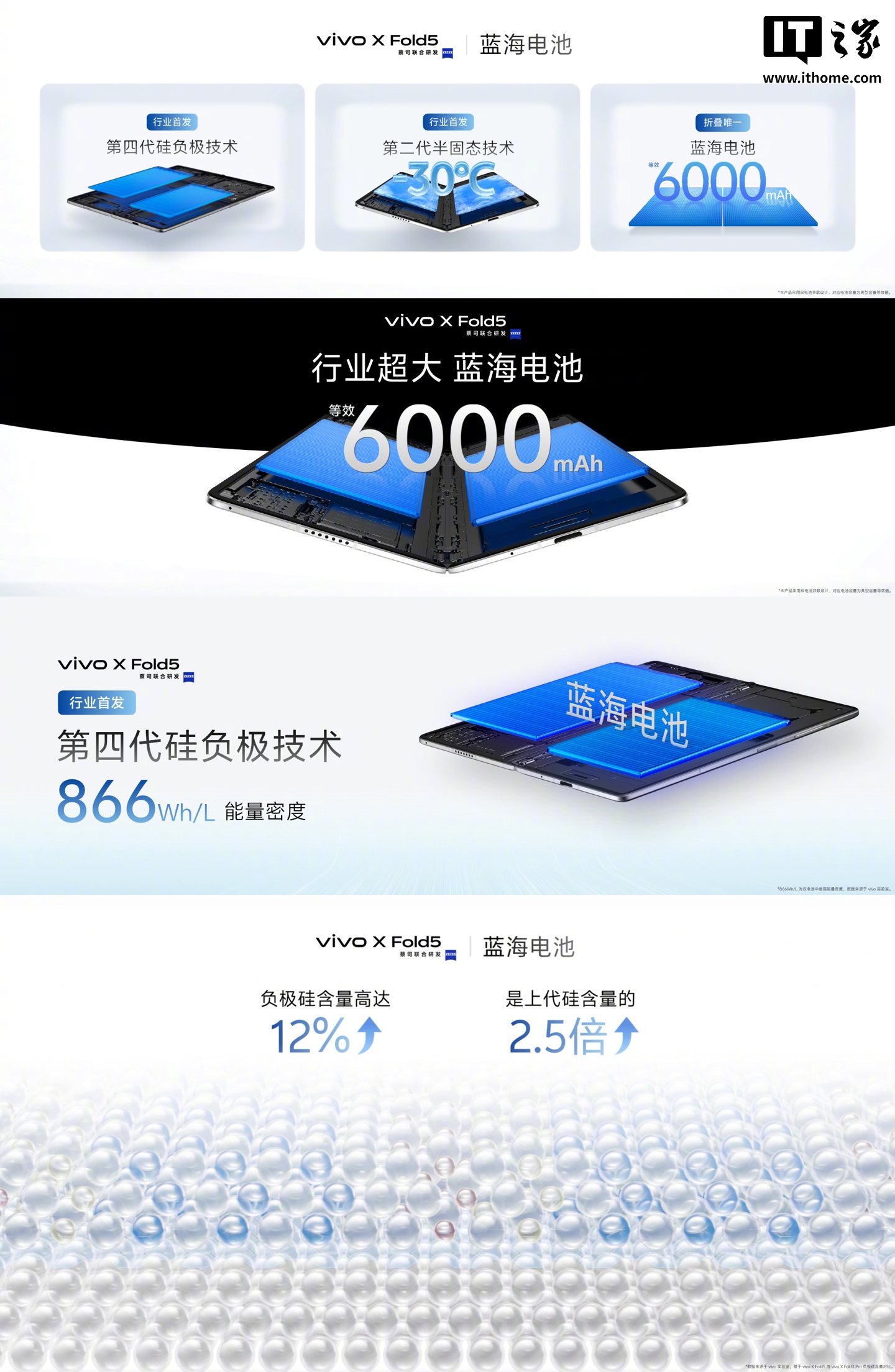 据介绍,vivo X Fold5 折叠首发等效 6000mAh 蓝海电池;行业首发第四代硅负极技术,能量密度至高达 866Wh / L,能量密度对比上代常温下提升 13%,低温环境下提升 20%;行业首发第二代半固态电池技术,实现-30℃电池正常供电。