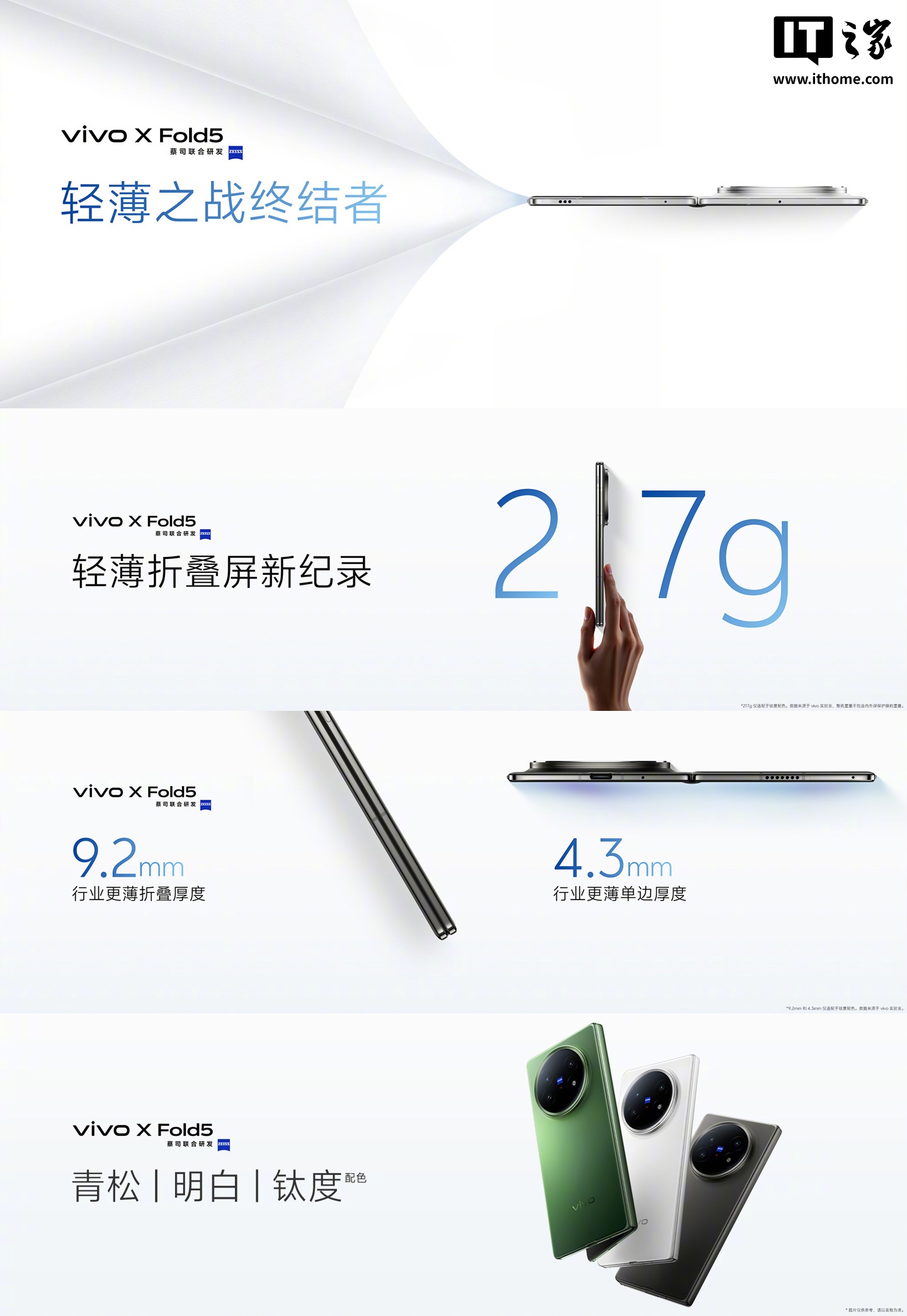 vivo X Fold5 折叠屏手机采用轻薄设计,重约 217g,折叠厚度约 9.2mm、单边厚度约 4.3mm,号称“轻过很多 Pro 级直板旗舰”,同时提供「钛度」「明白」「青松」三款配色。