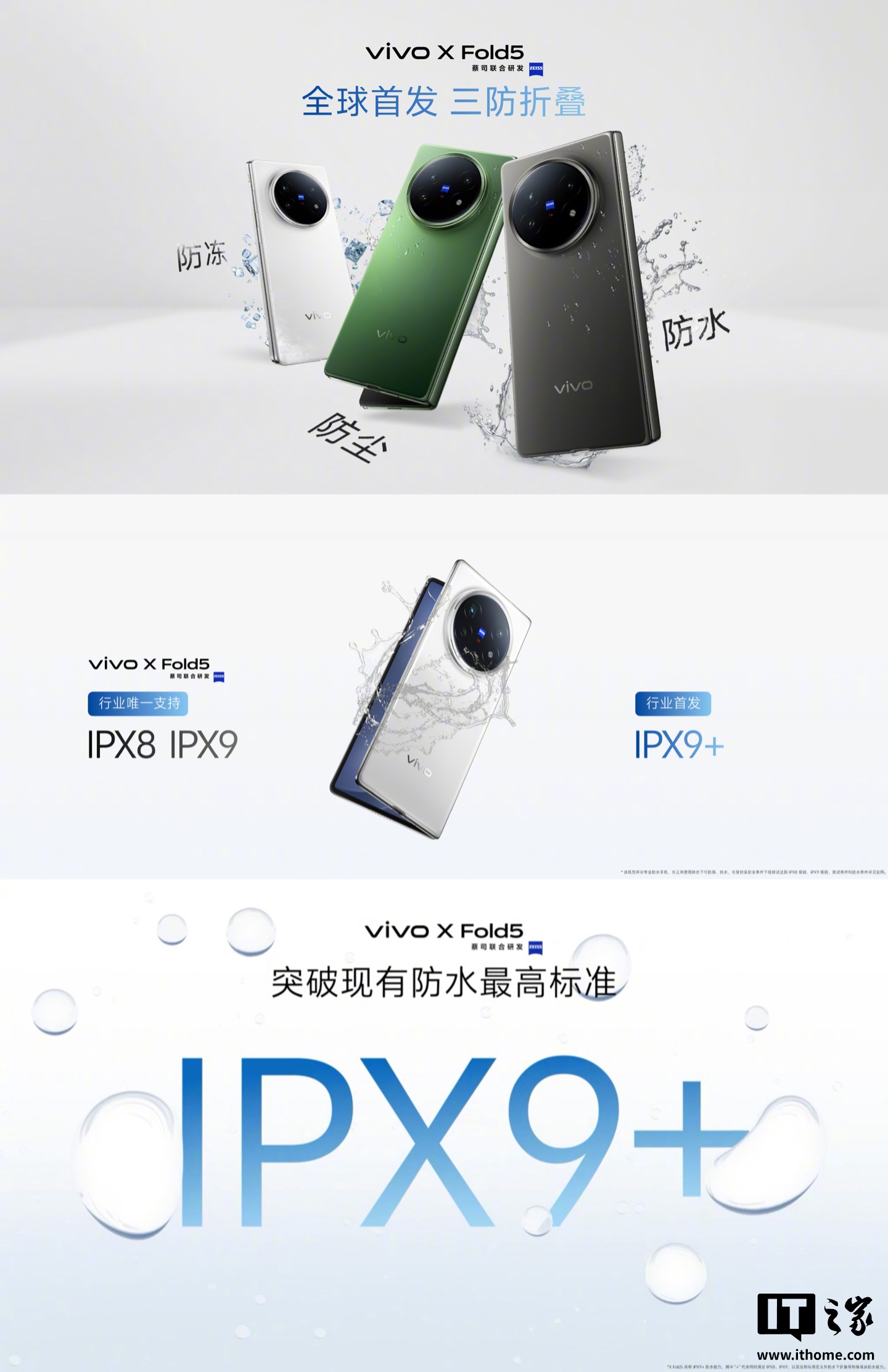 vivo X Fold5 折叠屏手机行业唯一支持 IPX8、IPX9 防水等级且同时具有 IPX9 + 防水能力的折叠屏,可承受 80° 热水和高压水枪的冲击;该机还是行业首个实现 IP5X 级防尘的折叠屏;支持防冻特性,整机在-20℃仍可正常使用,可以做到通话 20h、导航接近 10h、视频录制超过 4h。