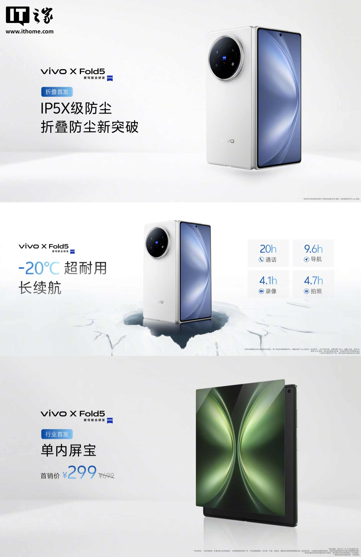 另外,IT之家从发布会获悉,vivo X Fold5 还首创内屏单独拆装设计,推出单内屏宝,首销期间限时折扣价仅需 299 元,享受一年内免费内屏更换服务。