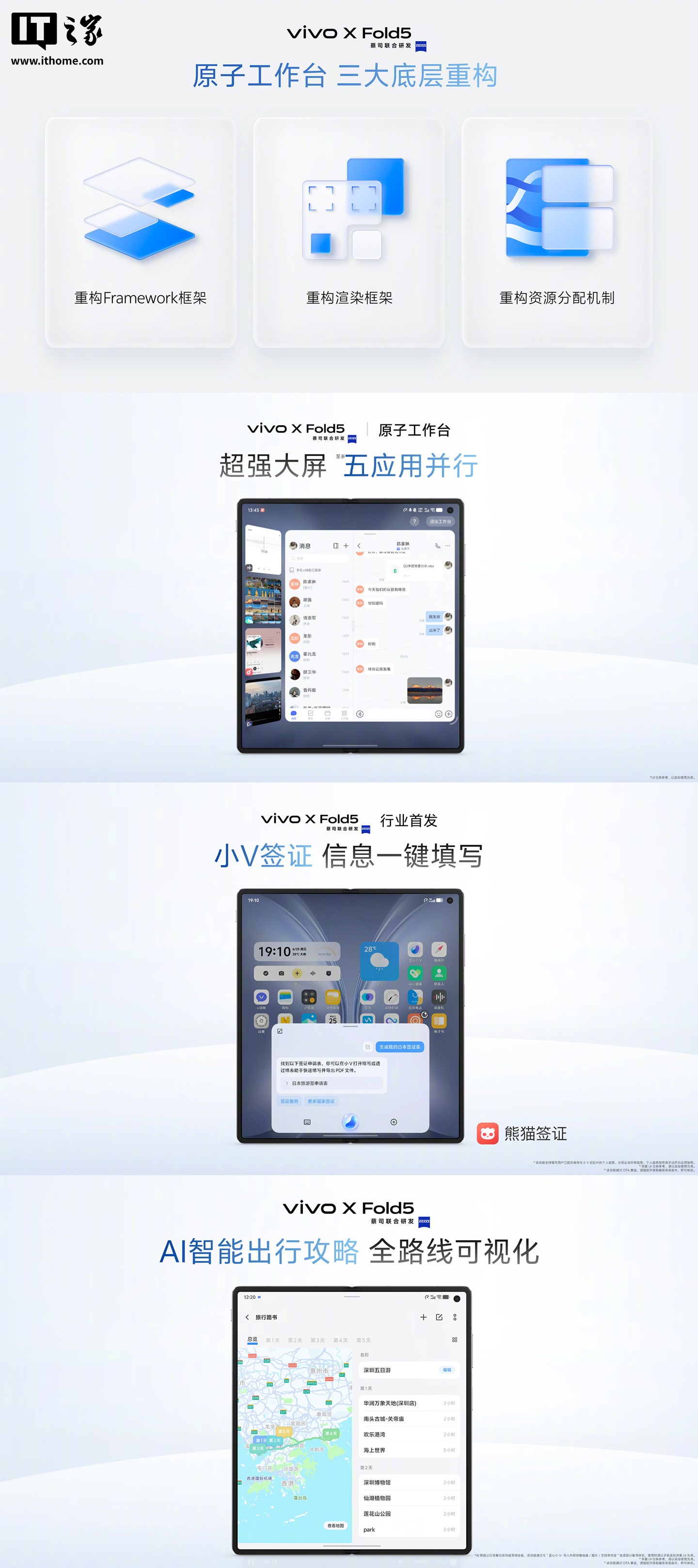 vivo X Fold5 折叠屏手机支持「原子工作台」,带来全新多任务交互方案。通过重构 Framework 框架、渲染框架和系统资源分配机制,实现至多五个应用同时运行;支持丝滑切换和跨应用拖拽文件,适用于多种复杂场景,如会议、办公、购物比价等,显著提升使用效率。