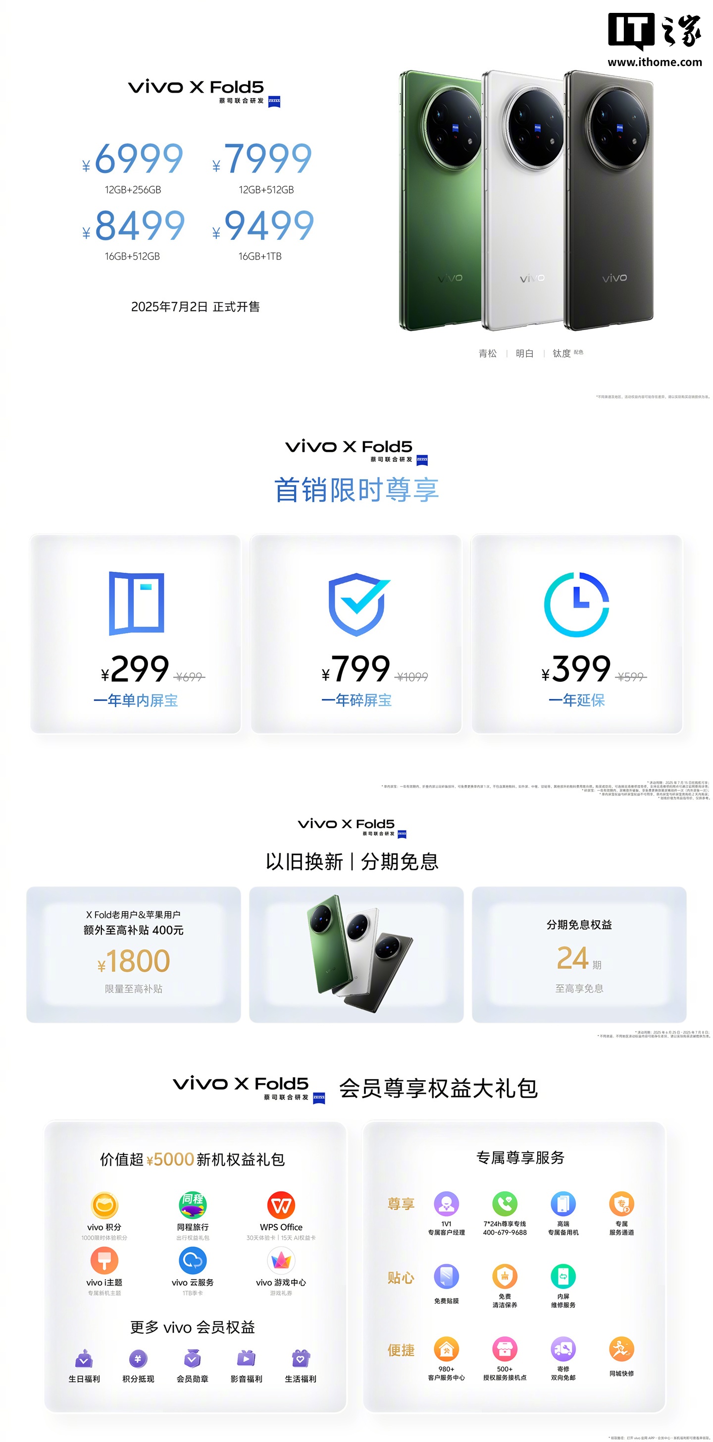 vivo 官方表示,7 月 15 日前购机,可 299 元购一年单内屏宝、799 元一年碎屏宝和 399 元一年延保服务;以旧换新至高 1800 元补贴;至高 24 期分期免息,并赠送价值超 5000 元的尊享权益礼包。新机首销权益如下: