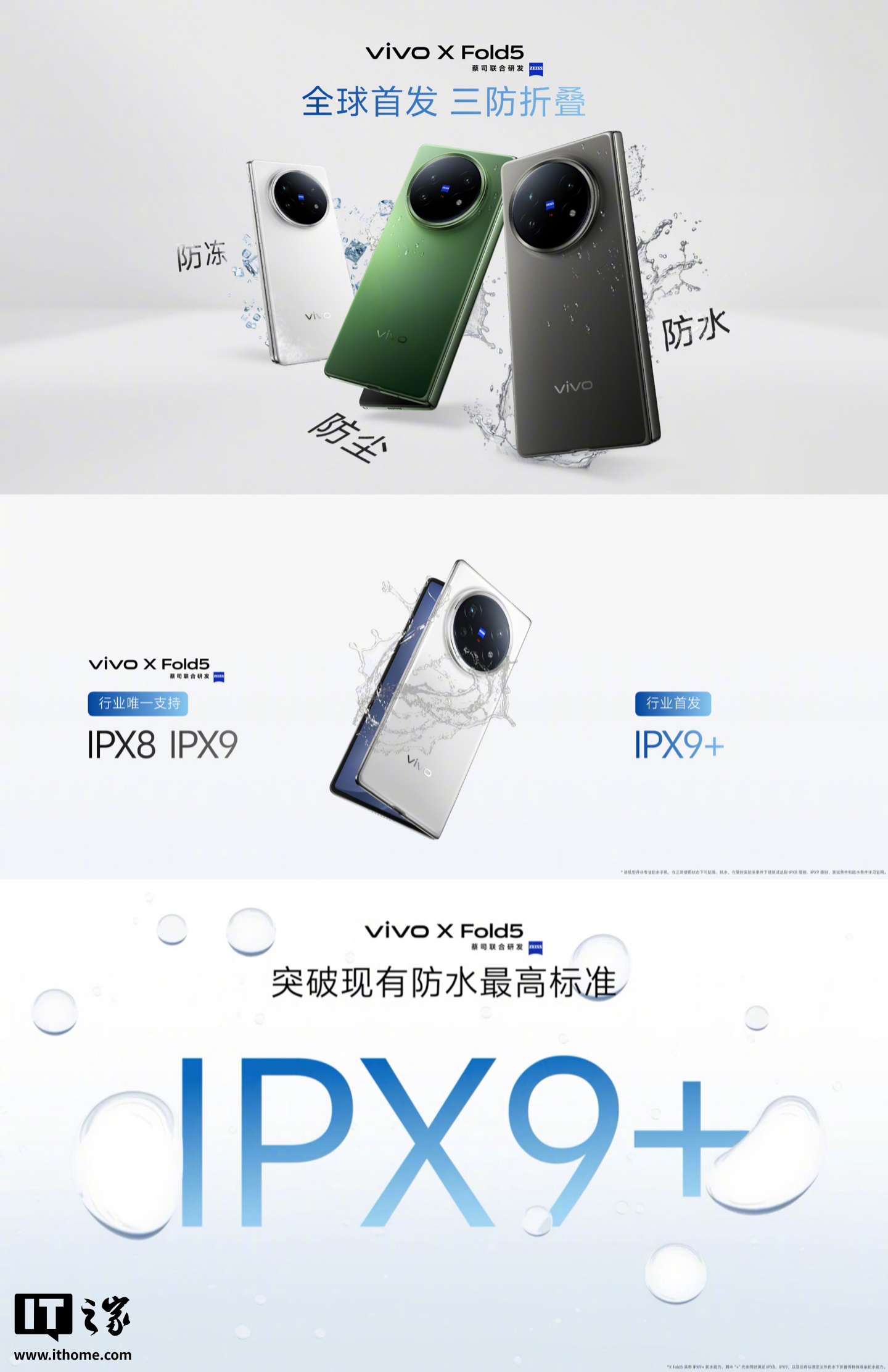 IT之家从发布会获悉,vivo X Fold5 折叠屏手机宣称是行业唯一支持 IPX8、IPX9 防水等级且同时具有 IPX9 + 防水能力的折叠屏,探索水下 3m,还能承受 80° 热水和高压水枪的冲击。