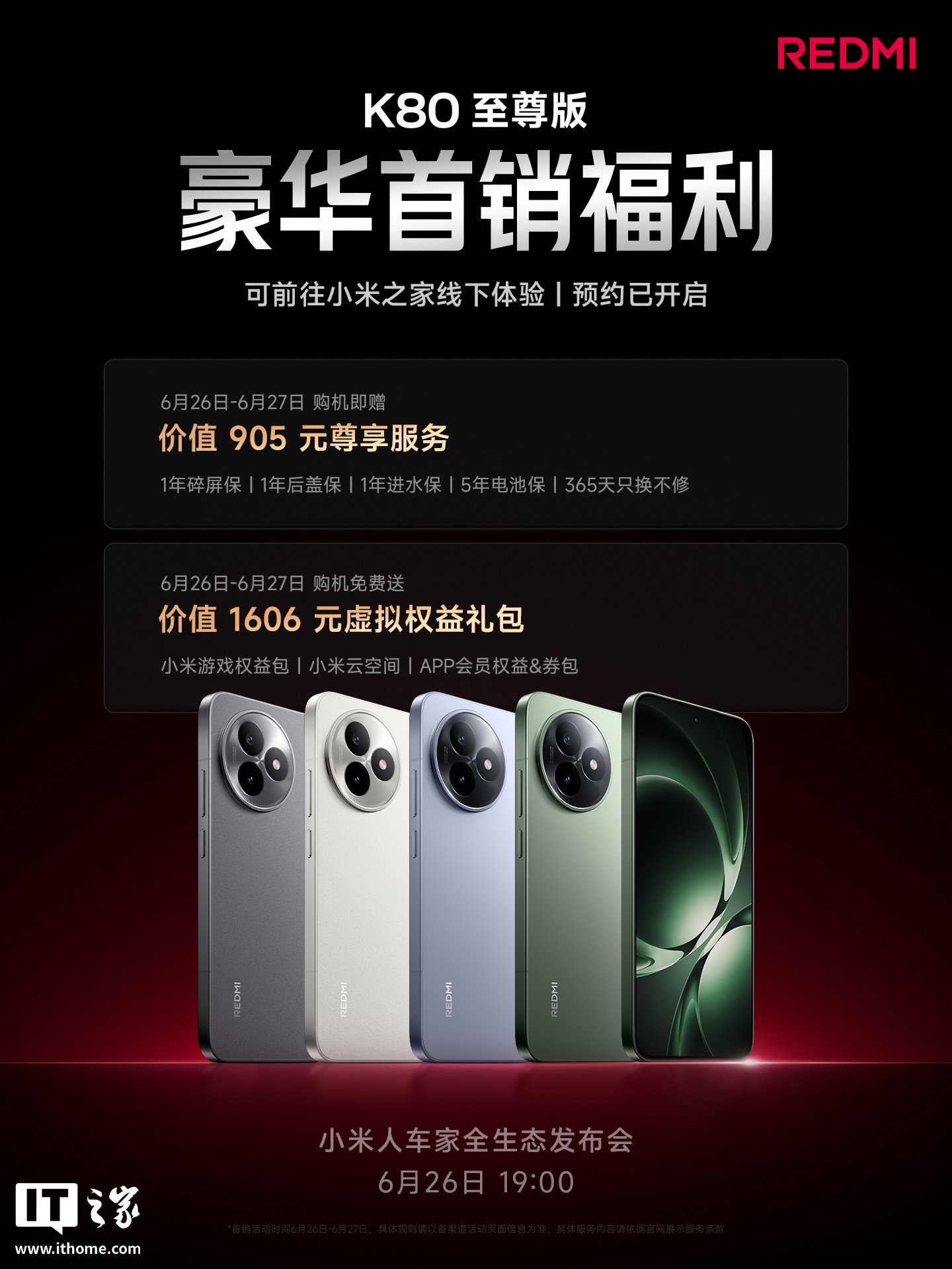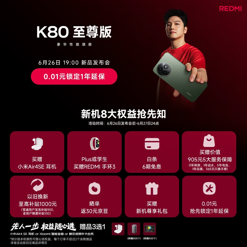 小米 REDMI K80 至尊版手机首销权益(6 月 26 日-6 月 27 日):