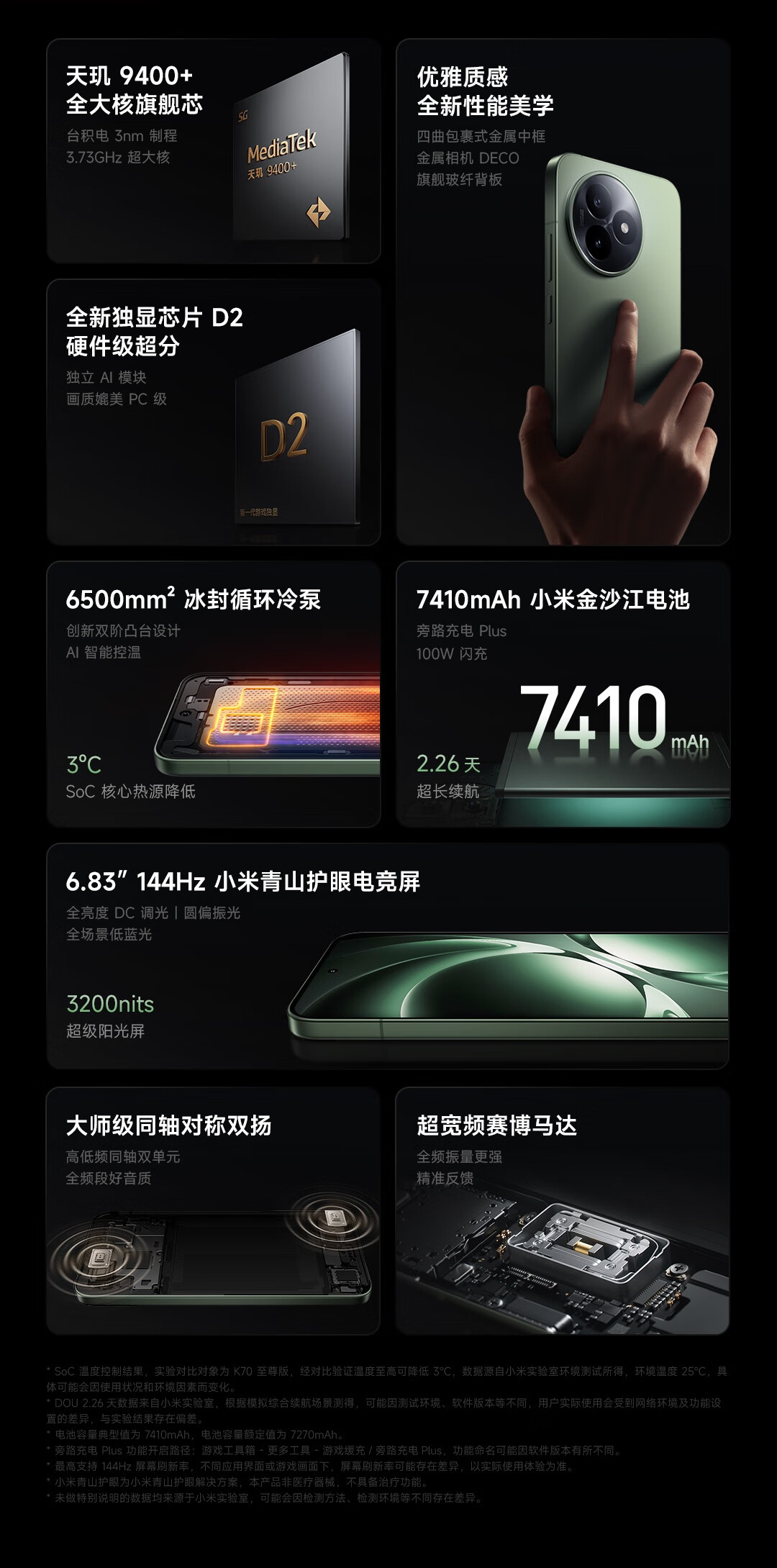 续航:7410mAh 电池 | 2.26 天 DOU | 升级旁路充电 Plus | 小米首发 100W 闪充