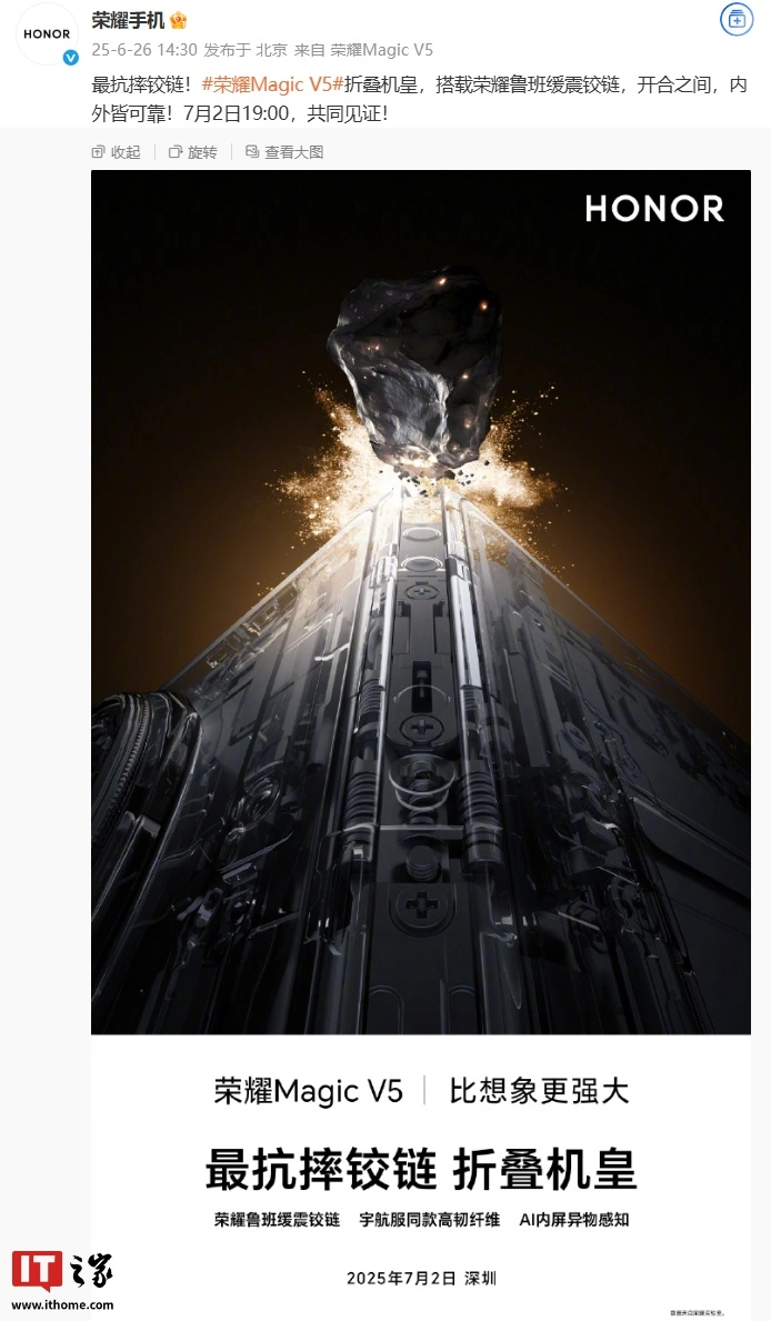 IT之家 6 月 26 日消息,荣耀 Magic V5 手机将于 7 月 2 日 19 时的荣耀 Magic V5 暨 AI 生态终端发布会上正式登场,官方正持续预热新机。