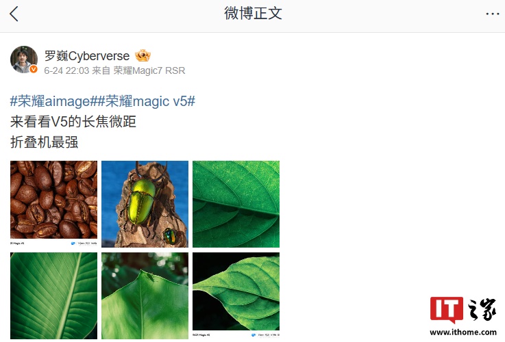 据IT之家昨日报道,荣耀首席影像工程师罗巍此前分享了 Magic V5 新机的样片,并透露该机支持长焦微距,号称“折叠机最强”。
