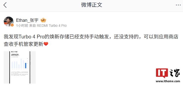 另外,张宇今日还发文透露,Turbo 4 Pro 的焕新存储已经支持手动触发。有网友针对“手动焕新存储没有,应用商店也没推送”这一情况进行询问,张宇表示“灰度的,别急”。