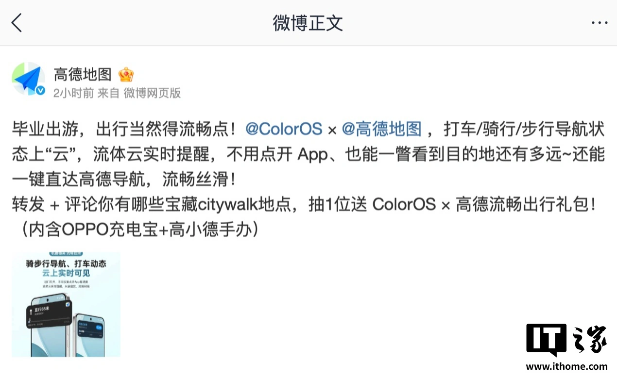 文章来源于互联网:IT之家-高德地图上线 OPPO ColorOS 系统“流体云通知”,支持导航、打车动态