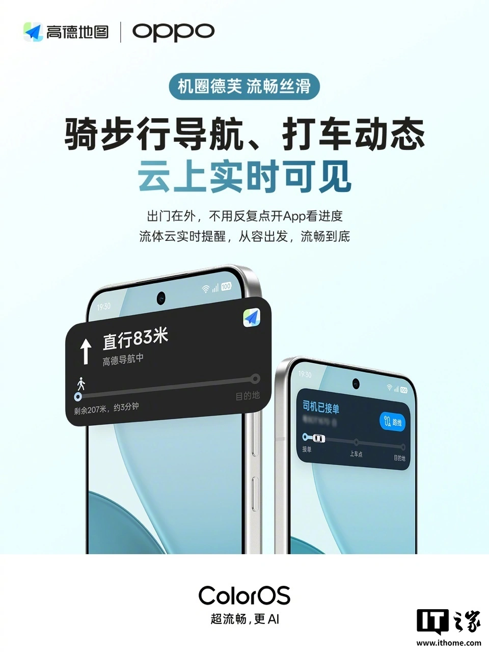 IT之家 6 月 26 日消息,高德地图今日发布微博,宣布其 App 上线 OPPO ColorOS 系统的“流体云通知”,可在不打开 App 的情况下了解导航、打车动态。
