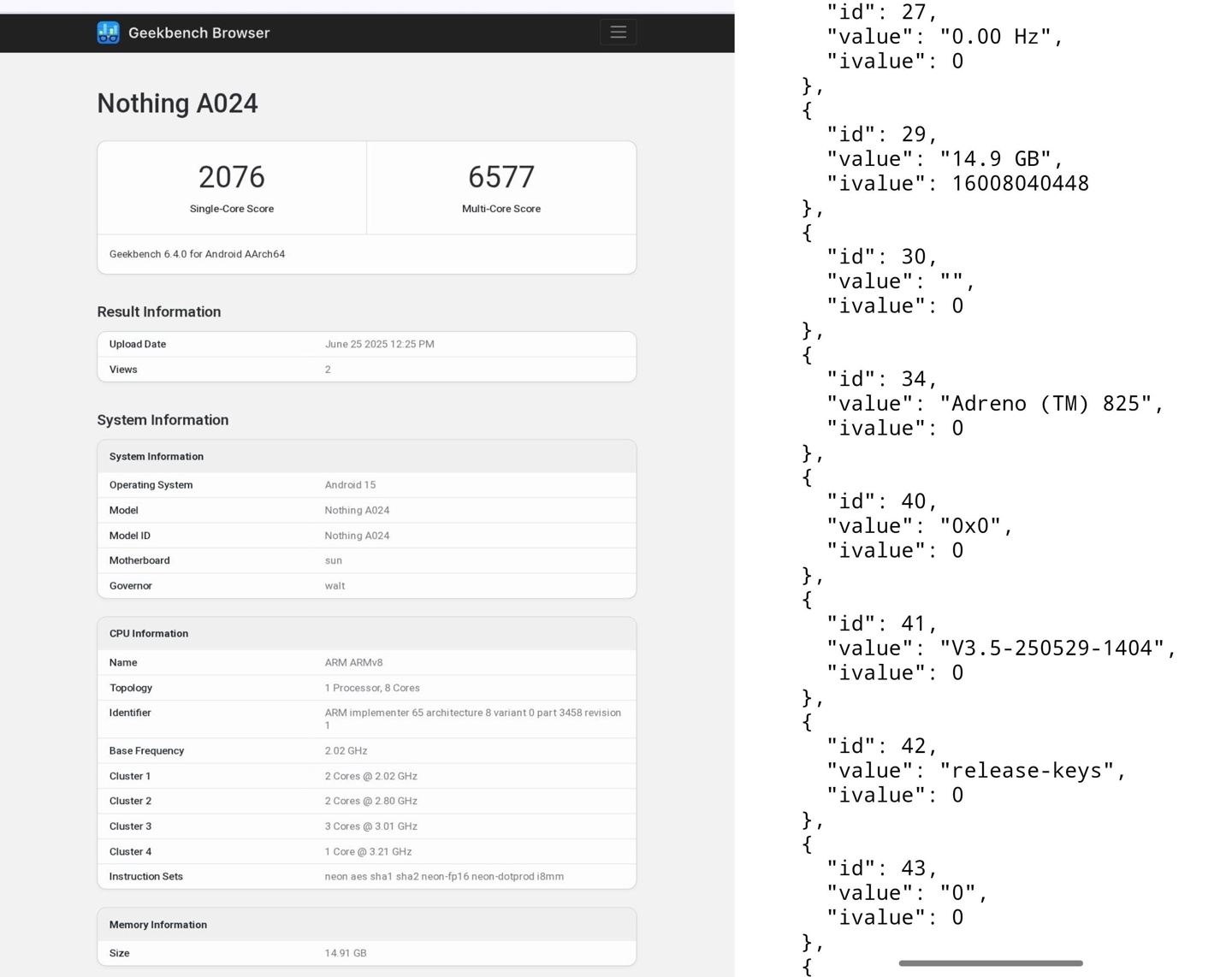 该机型号为 A024,根据跑分库页面信息,确认该机配备高通骁龙 8s Gen 4 芯片(配 Adreno 825 GPU),此外运行基于安卓 15 的 Nothing OS 3.3 系统,以及 16GB 内存。