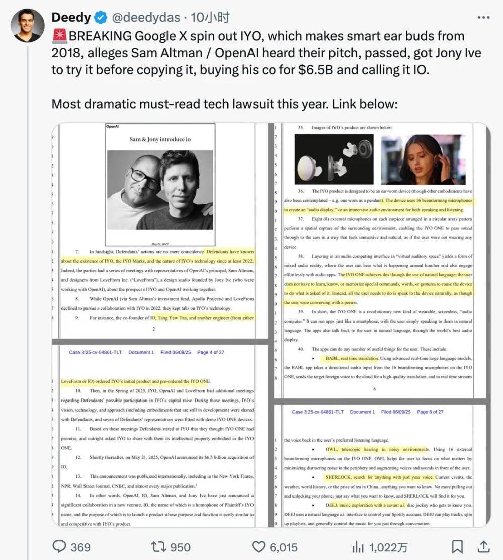 根据其诉状披露,OpenAI至少从2022年起就知晓IYO的品牌、产品与商标情况,且双方曾多次会面,包括与Sam Altman、Jony Ive所创办的LoveFrom工作室展开初步接洽。