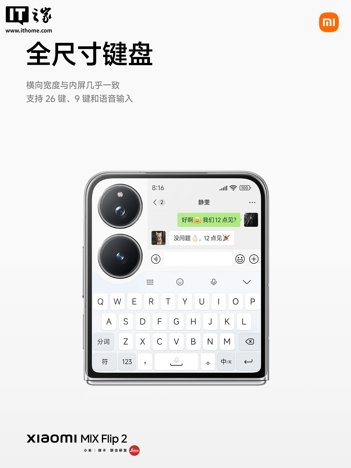 影像方面,小米 MIX Flip 2 搭载 50MP 徕卡主摄(光影猎人 800、光学防抖)+ 50MP 徕卡超广角。