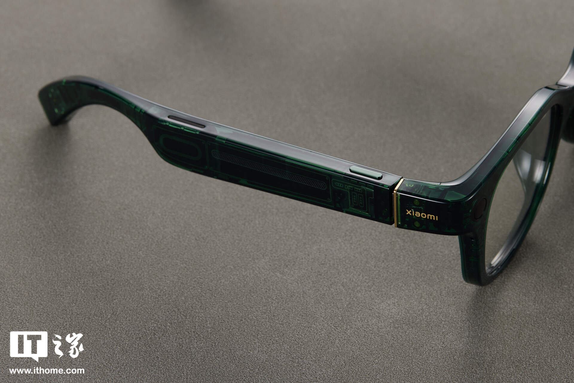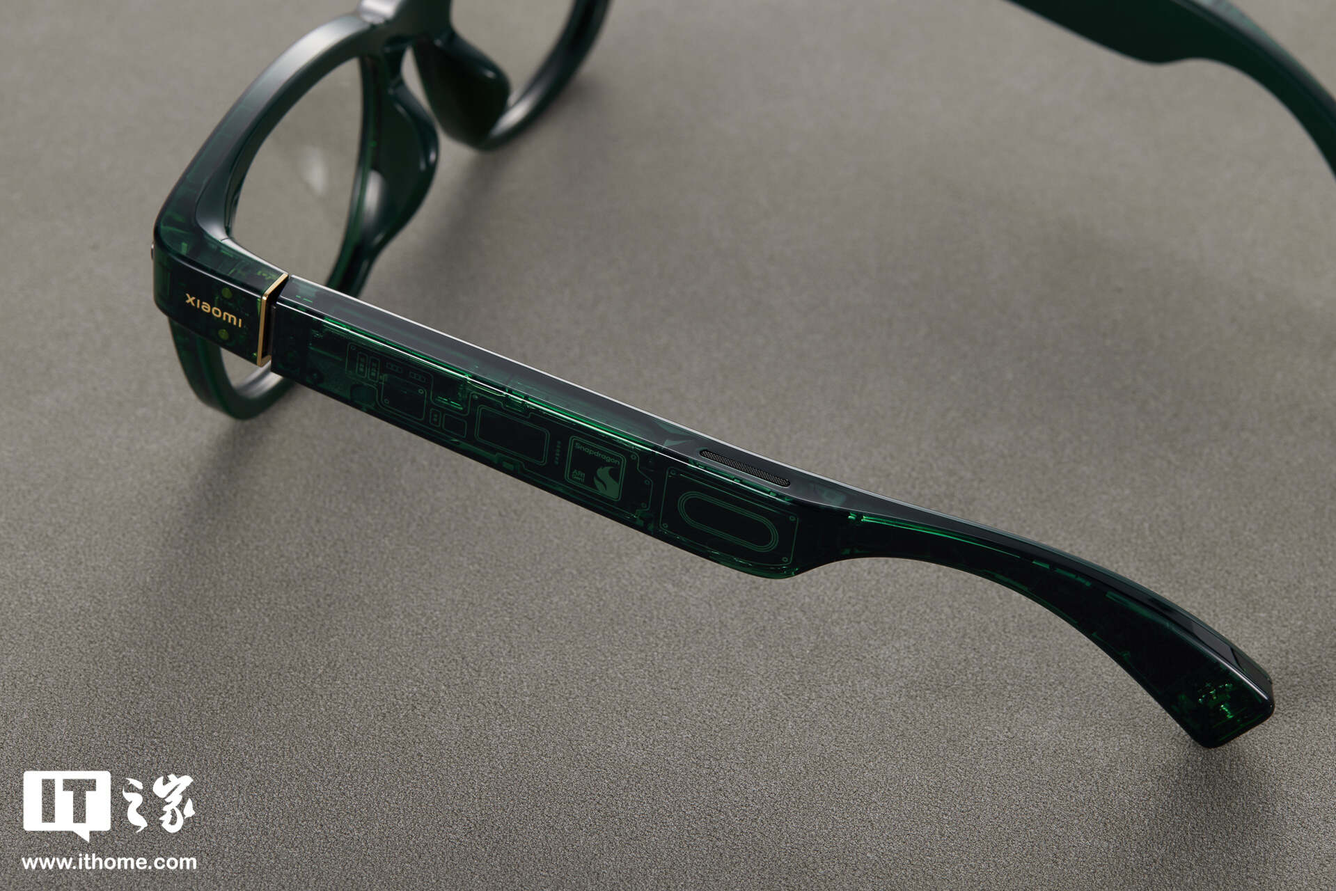 IT之家这次实拍的为鹦鹉绿配色,尽管采用了半透明设计,但是只有当你非常靠近眼镜的时候,才能看到透明内部的电路纹理。稍远一点,或许会当成是眼镜本身的装饰图案。