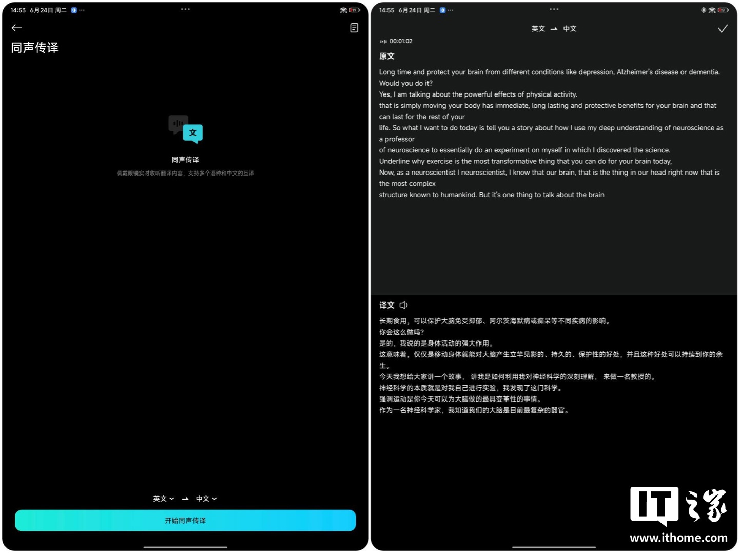 用起来也是巨简单:打开小米眼镜 App 选“翻译”,点“开始同声传译”就行。眼镜会一边收音一边播翻译,不过因为要走云端翻译流程,延迟大概 5-10 秒,适合听节奏慢的内容,比如跟外国人开视频会议。