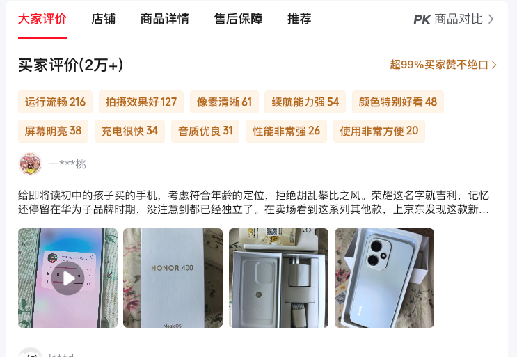 比如不久前主打 AI 2 亿超清写真人像的荣耀 400 系列就获得了市场和口碑的双丰收。根据官方的信息,该系列首销日销量同比荣耀 300 系列增长 195%,同比荣耀 200 系列增长 138%,打破近三年荣耀手机首销日销量纪录。并且在 2.5K-4K 这个价格档位,荣耀 400 系列也轻松拿下了 618 期间乃至 2025 年开年以来的新品首销冠军。该系列目前京东累计超过 2 万的评价中好频率超过 99%,其中“拍摄效果好”成为仅次于运行流畅的用户点赞理由。
