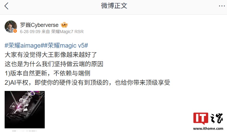 IT之家 6 月 29 日消息,荣耀首席影像工程师罗巍昨日发文称大王影像越来越好了,并提及了做云端的原因:版本自然更新,不依赖于端侧;AI 平权,即使你的硬件没有到顶级的,也给你带来顶级享受。