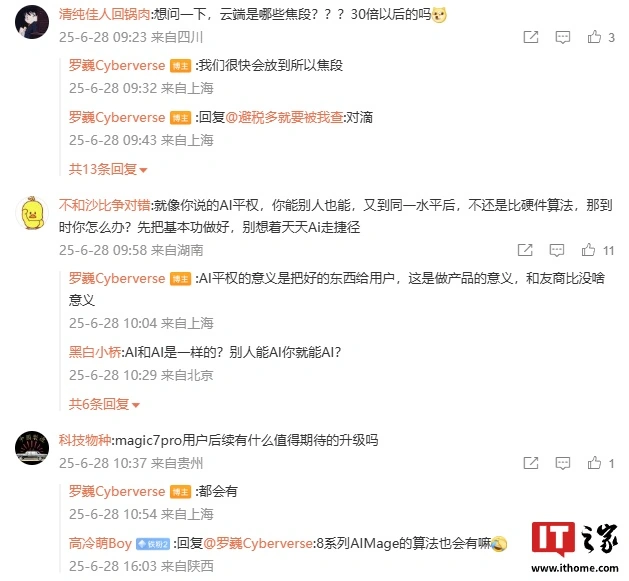 另外,罗巍还在评论区回复了部分网友的问题:针对云端是哪些焦段,是否为 30 倍以后,他表示“我们很快会放到所以焦段”(此处的所以预计为“所有”);针对别人也能 AI,他称“AI 平权的意义是把好的东西给用户,这是做产品的意义,和友商比没啥意义”;针对 Magic7 Pro 手机用户后续是否有值得期待的升级,他回复“都会有”。